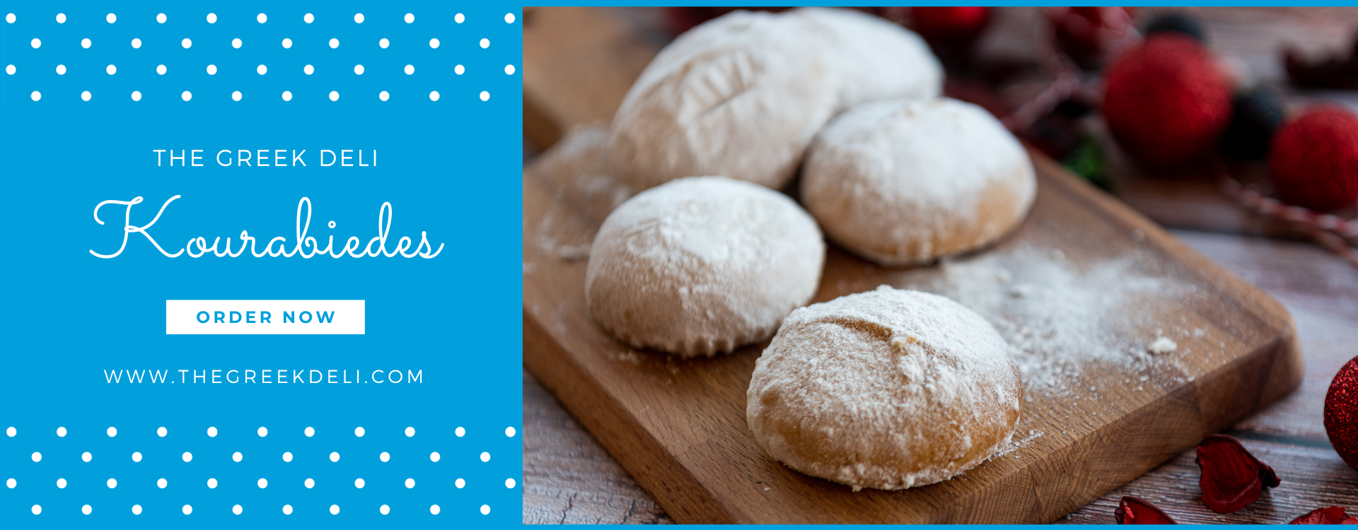 Kourabiedes or Kourabiethes are almond biscuits or cookies popular in Greece, Cyprus, and Greek communities in Anatolia, as well as across the Greek diaspora. This festive dessert has become synonymous – along with melomakarona and diples – of the Christmas table.