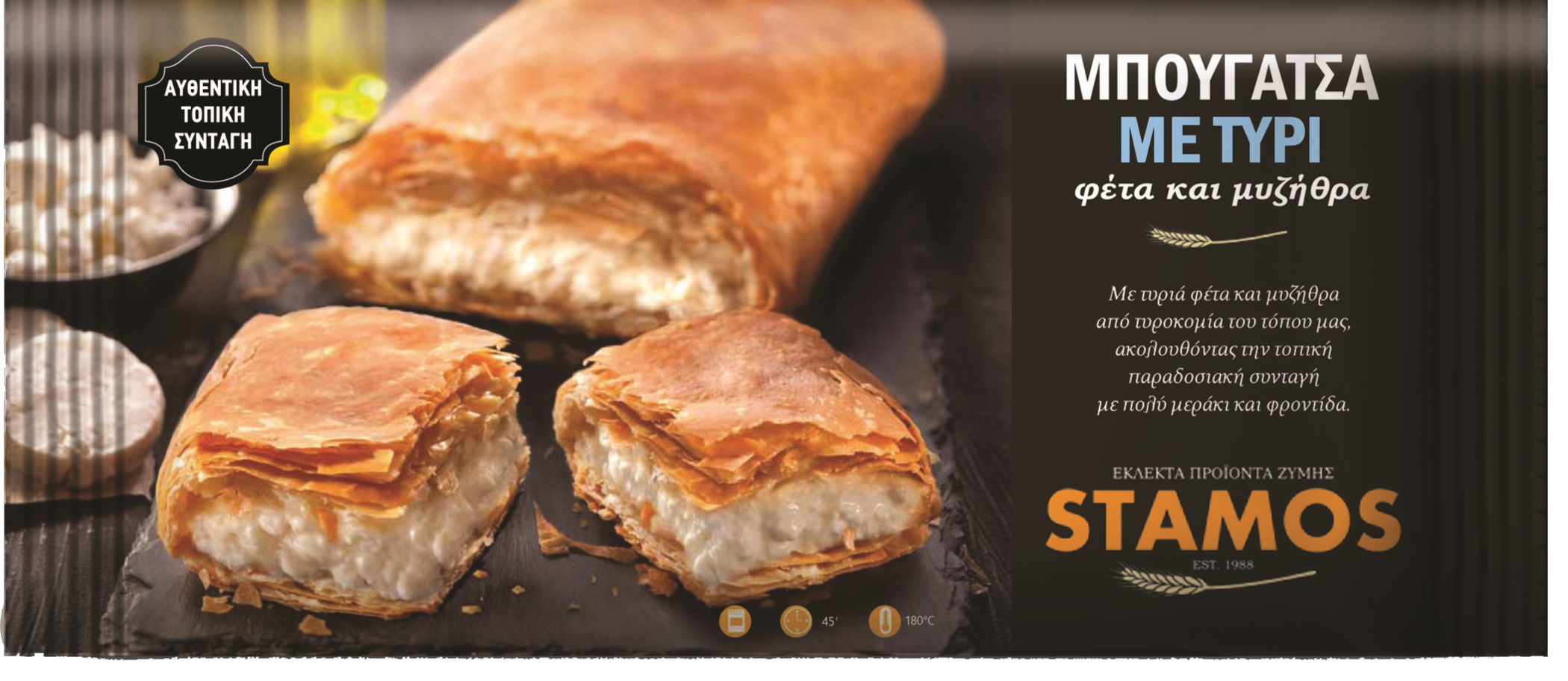 You will absolutely love our traditional bougatsa with feta cheese. The recipe is from the area of Pelion mountain. Its hand rolled bougatsa filo pastry & rich filling make it simply irresistible.